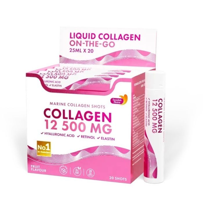 Collagen 12 500 mg е хранителна добавка, съчетаваща колаген с ретинол, еластин и антиоксиданти. Комбинацията е насочена към поддържане на стегната, сияйна и ревитализирана кожа. Спомага за косата и ноктите, носи ползи за ставите. Благодарение на комбинацията от висока доза морски колаген, антиоксиданти, ретинол, хиалуронова киселина и еластин, тази добавка действа комплексно отвътре-навън. Формулата има свойството да подпомага хидратацията, води до запълване на фини линии и бръчки и изравнява тена. Регенерира и притежава съставки с антиоксидантни свойства. Рибен колаген 12 500 мг с хиалурон, ретинол и еластин се предлага в удобни сашета – идеални за пътуване или тренировка, в течна форма за лесно усвояване, без нужда от вода, без добавена захар, с естествени аромати и оцветители.