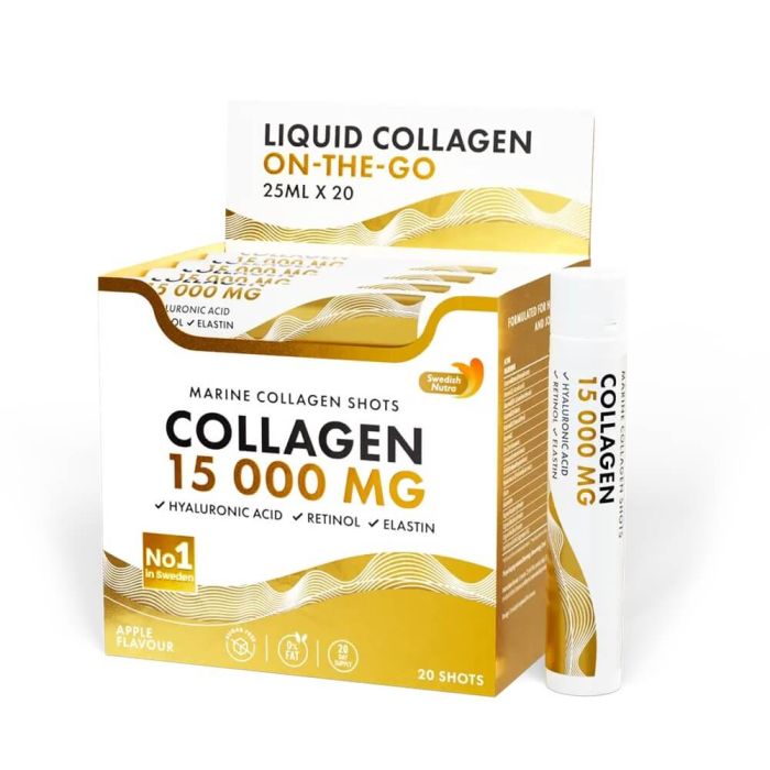 Collagen 15 000 mg е хранителна добавка, съчетаваща колаген с ретинол, еластин и антиоксиданти. Комбинацията е насочена към поддържане на стегната, сияйна и ревитализирана кожа. Спомага за косата и ноктите, носи ползи за ставите. Благодарение на комбинацията от висока доза морски колаген, антиоксиданти, ретинол, хиалуронова киселина и еластин, тази добавка действа комплексно отвътре-навън. Формулата има свойството да подпомага хидратацията, води до запълване на фини линии и бръчки и изравнява тена. Регенерира и притежава съставки с антиоксидантни свойства. Рибен колаген 15 000 мг с хиалурон, ретинол и еластин се предлага в удобни сашета – идеални за пътуване или тренировка, в течна форма за лесно усвояване, без нужда от вода, без добавена захар, с естествени аромати и оцветители.