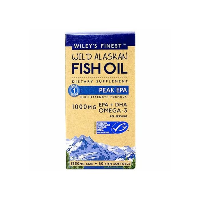 Wiley's Finest Wild Alaskin Fish Oil Peak EPA е хранителна добавка, която осигурява концентрирана доза от незаменимите EPA и DHA мастни киселини. Уайлис Файнест Уайлд Аляскан Рибено масло Омега-3 ЕПА е без рибен послевкус и с висока чистота, доказана с 5-звезден международен стандарт за безопасност на рибеното масло. Спомага нормалната мозъчна функция и зрение. Произведени са от концентрирано масло от дива риба - треска, уловена в Аляска. Не съдържа захар, глутен, нишесте, мая, пшеница, млечни продукти, изкуствени ароматизанти и оцветители, ядки, ракообразни, яйца, фъстъци, соя или царевица.