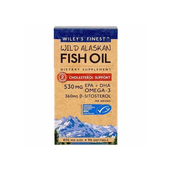 Wiley's Finest Wild Alaskin Fish Oil Cholesterol Support е хранителна добавка, която осигурява концентрирана доза от незаменимите EPA и DHA мастни киселини. Уайлис Файнест Уайлд Аляскан Рибено масло Омега-3 Холестерол съпорт е без рибен послевкус и с висока чистота, доказана с 5-звезден международен стандарт за безопасност на рибеното масло. Спомага нормалната мозъчна функция и зрение. Произведени са от концентрирано масло от дива риба - треска, уловена в Аляска. Формулата съдържа растителен стерол от бор, който подпомага за поддържане на нормални нива на холестерол в кръвта. Не съдържа захар, глутен, нишесте, мая, пшеница, млечни продукти, изкуствени ароматизанти и оцветители, ядки, ракообразни, яйца, фъстъци, соя или царевица.