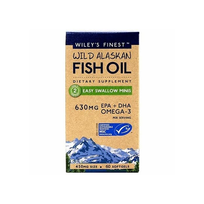 Wiley's Finest Wild Alaskin Fish Oil е хранителна добавка, която осигурява концентрирана доза от незаменимите EPA и DHA мастни киселини. Създадени за максимално удобство, тези мини меки капсули са 55% по-малки от стандартните капсули с рибено масло, което ги прави изключително лесни за преглъщане, дори от хора с чувствителност към големи таблетки. Въпреки компактния си размер, всяка капсула съдържа 30% повече омега-3 мастни киселини от средната хранителна добавка с рибено масло. Уайлис Файнест Уайлд Аляскан Рибено масло Омега-3 е без рибен послевкус и с висока чистота, доказана с 5-звезден международен стандарт за безопасност на рибеното масло. Спомага нормалната мозъчна функция и зрение. Произведени са от концентрирано масло от дива риба - треска, уловена в Аляска. Не съдържа захар, глутен, нишесте, мая, пшеница, млечни продукти, изкуствени ароматизанти и оцветители, ядки, ракообразни, яйца, фъстъци, соя или царевица.