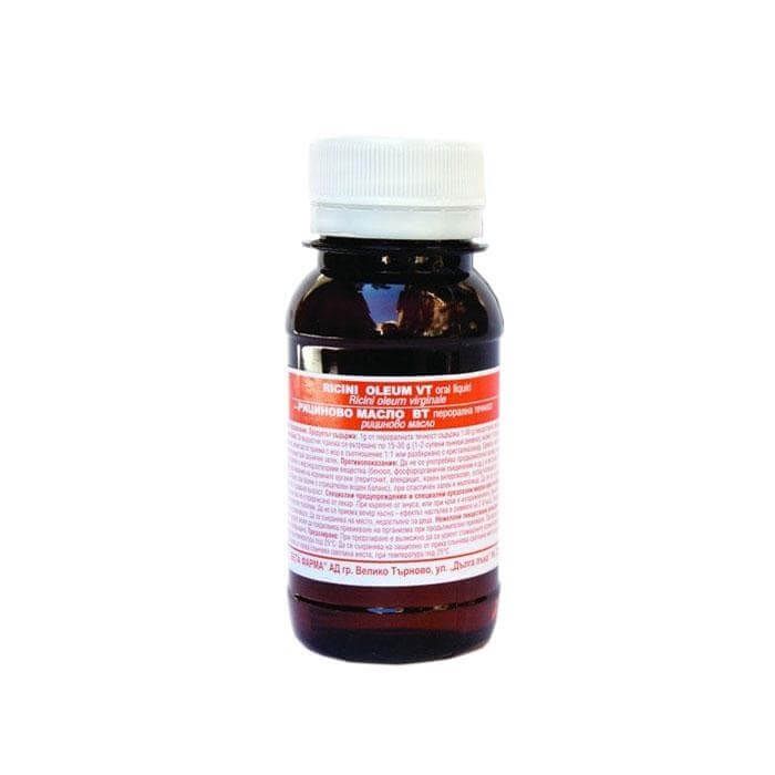 Veta Pharma Рициново масло (Ricini oleum) е средство със слабително действие, което се прилага за краткотрайно лечение при хроничен запек. Рициновото масло е сред най-добрите природни средства за кожата и косата. Често използвано в козметиката, рициновото масло прави кожата нежна, мека и гладка, а косата жизнена и блестяща. Рициновото масло подхранва, избелва, омекотява и заглажда кожата и изравнява тена. Рициновото масло е подходящо средство за почистване на грима.