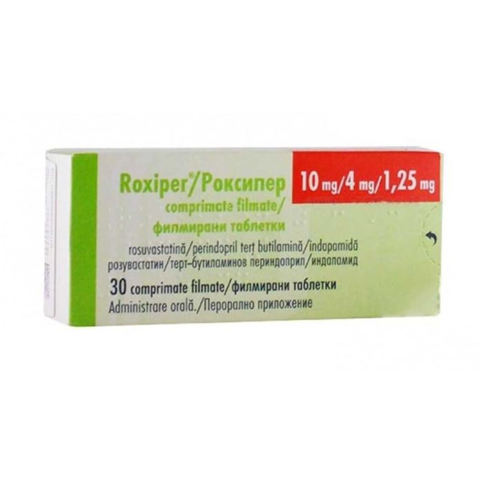 Роксипер 10 mg/4 mg/1.25 mg Филмирани таблетки: Всяка филмирана таблетка съдържа 10 mg розувастатин (като розувастатин калций), 4 mg терт-бутиламинов периндоприл и 1,25 mg индапамид.