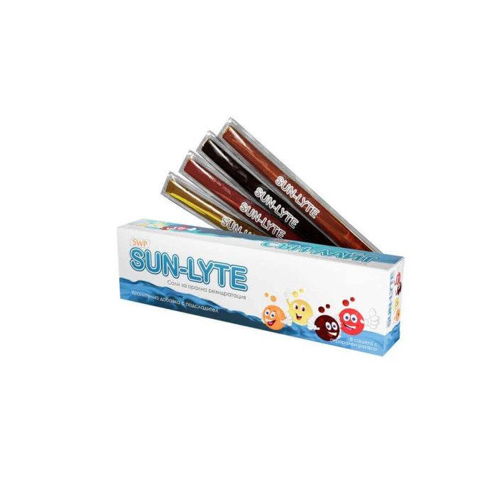 Sun-Lyte е хранителна добавка с глюкоза и електролити, която допринася за предотвратяване на дехидратация при деца. Специално създадена при загуба на големи количества вода. Сън-Лайт бързо компенсира загубените течности и електролити в случай на диария и/или повръщане. Опаковка с 8 сашета с различни вкусове: портокал, лимон, ягода и кола.