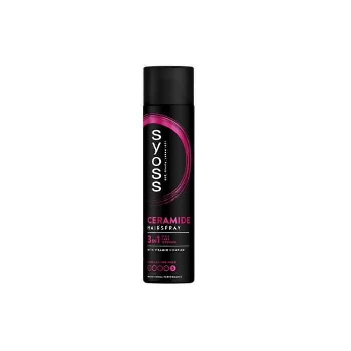 Syoss Ceramide Complex Hair Spray е лак за коса с мега силна фиксация (ниво 5), който осигурява до 48 часа дълготраен контрол над прическата. Формулата му е 3‑в‑1, като предоставя стилизиране, грижа и защита, благодарение на витаминния комплекс с пантенол и ниацинамид, които укрепват структурата на косъма и подпомагат здравия му вид. Сайс Серамид Комплекс Лак за коса фиксира прическата без да слепва косата, позволява лесно разресване и запазва естествената ѝ еластичност. Продуктът също така предпазва косата от влага и UV лъчи, което го прави подходящ за ежедневно стилизиране в различни условия.