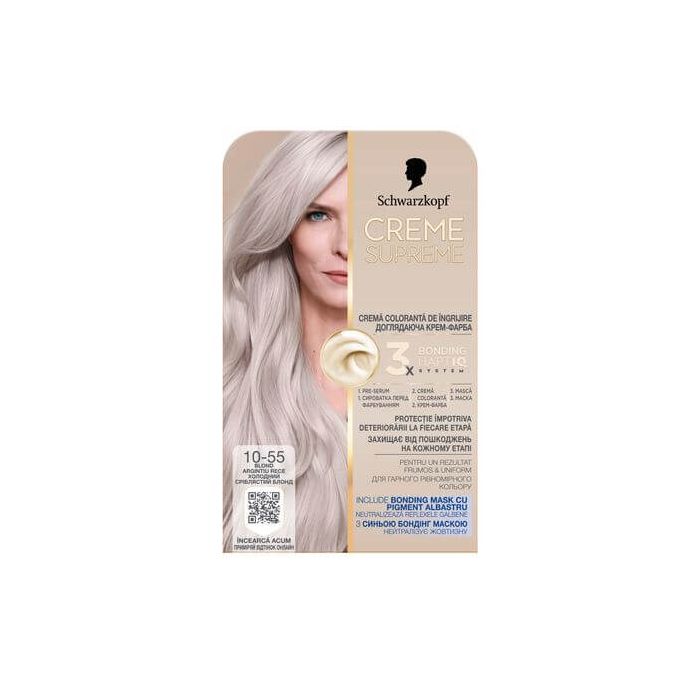 Schwarzkopf Creme Supreme е дълготрайна боя за коса с тройна Bonding HaptIQ система за интензивна грижа за косата. Осигурява дълготраен цвят с до 100% покритие на сивите коси. Действа в 3 стъпки: