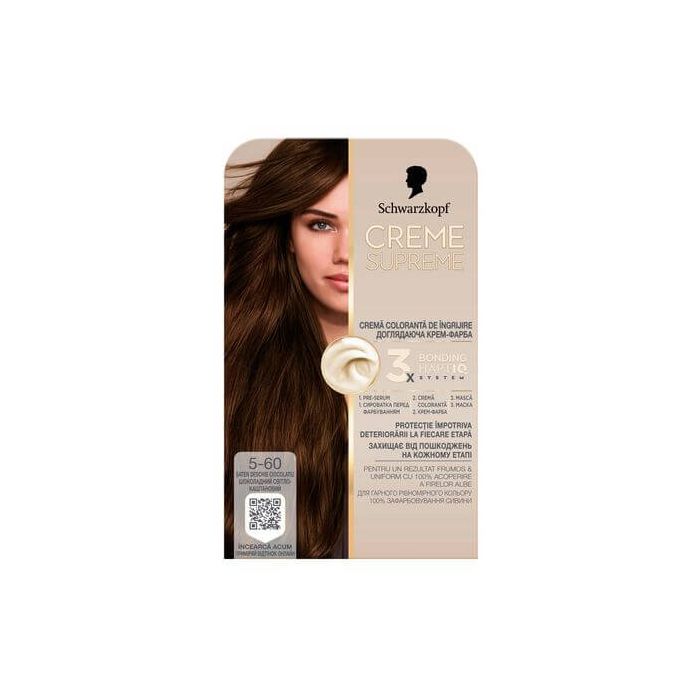 Schwarzkopf Creme Supreme е дълготрайна боя за коса с тройна Bonding HaptIQ система за интензивна грижа за косата. Осигурява красив и равномерен цвят с до 100% покритие на сивите коси. Действа в 3 стъпки: