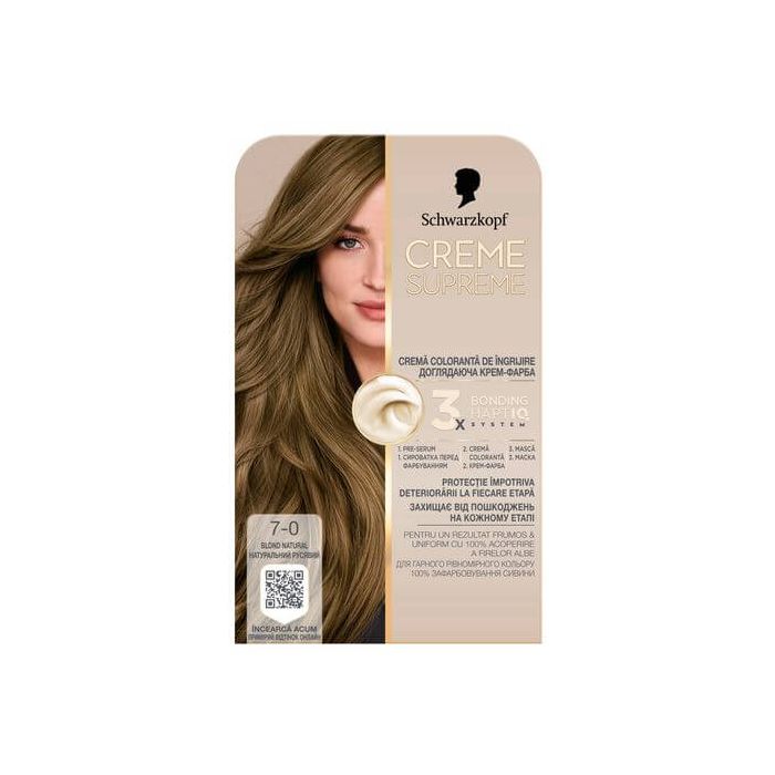 Schwarzkopf Creme Supreme е дълготрайна боя за коса с тройна Bonding HaptIQ система за интензивна грижа за косата. Осигурява красив и равномерен, прекрасен рус цвят с до 100% покритие на сивите коси. Действа в 3 стъпки: