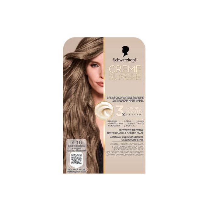 Schwarzkopf Creme Supreme е дълготрайна боя за коса с тройна Bonding HaptIQ система за интензивна грижа за косата. Осигурява красив и равномерен, прекрасен рус цвят с до 100% покритие на сивите коси. Действа в 3 стъпки: