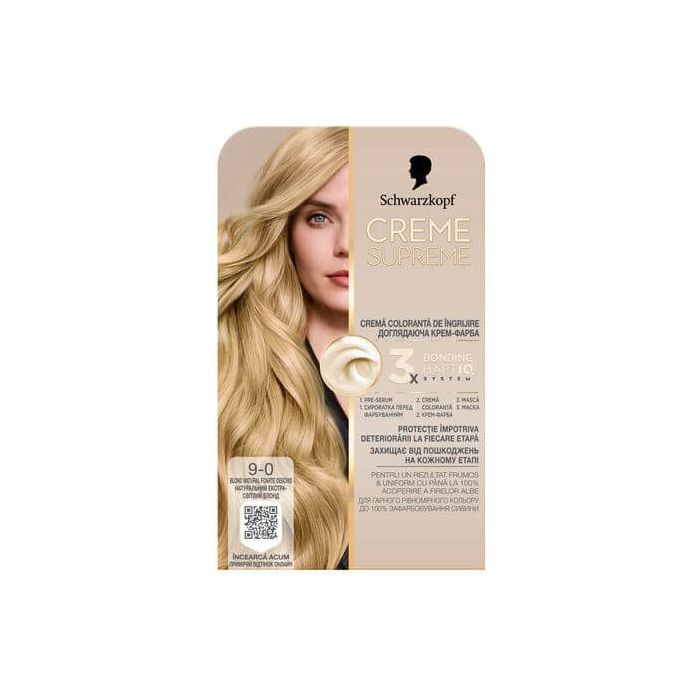 Schwarzkopf Creme Supreme е дълготрайна боя за коса с тройна Bonding HaptIQ система за интензивна грижа за косата. Осигурява красив и равномерен, чудесен рус цвят с до 100% покритие на сивите коси. Действа в 3 стъпки: