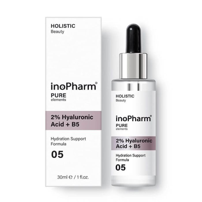 Inopharm Pure elements HA + Vitamin B5 Hydration Support Formula e серум за лице с 2% хиалуронова киселина и витамин В5, който е разработен специално за дехидратирана кожа, предразположена към образуването на фини линии и бръчки. Инофарм Пюр Елементс Серум за лице с 2% хиалуронова киселина и витамин В5 хидратира кожата и я дарява с еластичност и мекота. Хиалуроновата киселина възстановя плътността на кожата. Дерматологично тестван.