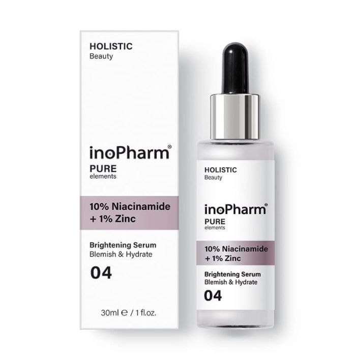 Inopharm Pure elements 10% Niacinamide + 1% Zink Brightening Serum e серум за лице с 10% Ниацинамид и 1% Цинк. Ниацинамидът (витамин B3) помага за намаляване на появата на кожни несъвършенства и натрупвания. Високата му концентрация във формулата балансира прекомерното производство на себум. Ефективно спомага за изсветляване на тона на кожата. Инофарм Пюр Елементс Серум за лице с 10% Ниацинамид и 1% Цинк е подходящ за всеки тип кожа. Дерматологично тестван."