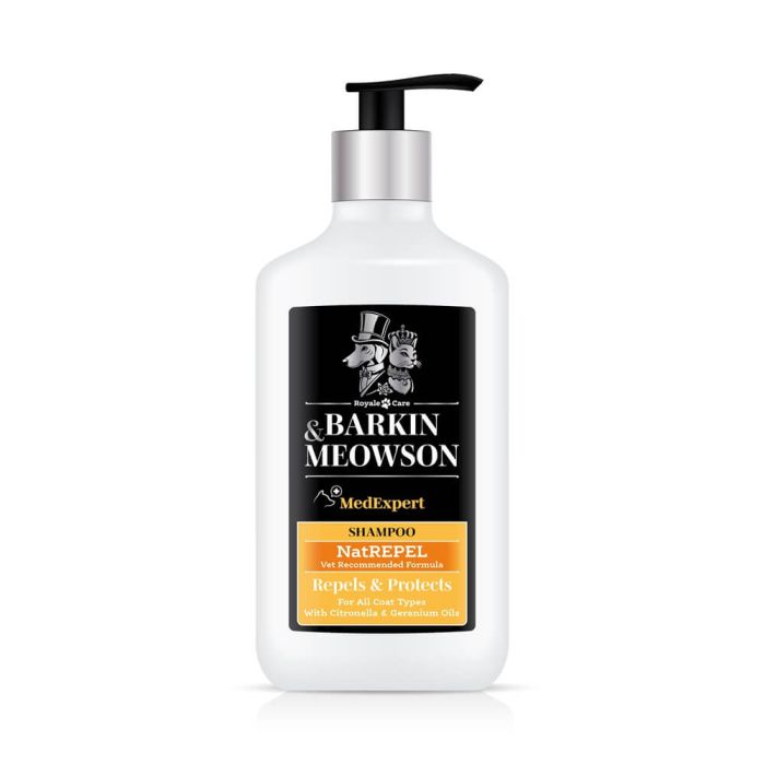 Barkin&Meowson MedExpert Protective Shampoo Natrepel е формула с натурални съставки, предназначена за кучета, която отблъсква кърлежи, бълхи и комари. Използва се като допълваща грижа към стандартните обезпаразитяващи лекарствени средства. В състава на шампоана са включени етерични масла от здравец и цитронела, както и млечна киселина и D-пантенол с хидратиращи и успокояващи свойства. Баркин и Мяусън Шампоан-репелент за кучета е подходящ за всички типове козина.