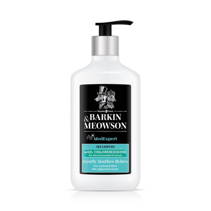Barkin & Meowson Shampoo with Chlorhexidine е специализиран шампоан, създаден за поддържаща грижа при кожни проблеми, сърбеж и раздразнения, при кучета и котки. Подходящ е както по време на възстановяване след възпалителни състояния на кожата, така и като част от съпътстваща терапия. Формулата му едновременно успокоява, овлажнява и намалява усещането за дискомфорт. Активната съставка хлорхексидин, в комбинация с пироктон оламин, има антисептично, антибактериално и противогъбично действие. Добавените растителен колаген и млечна киселина подхранват кожата и козината, като осигуряват дълбока хидратация и улесняват разресването. Съдържащият се комплекс от пребиотици и пробиотици подсилва естествената защитна бариера на кожата и подпомага възстановяването ѝ. D-пантенолът допълнително успокоява и регенерира раздразнената кожа. Баркин и Мяусън Шампоан с хлорхексидин за кучета и котки има деликатен аромат, безопасен за домашни любимци.