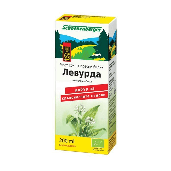 Schoenenberger Био сок от левурда е напълно натурален продукт. Левурдата или див чесън има силни антибактериални свойства, действащи пречистващо на кръвоносните съдове. Шьоненбергер Био сок от левурда регулира нивата на холестерол и подобрява цялостната сърдечна дейност. Може да бъде използван и като имуностимулант прес зимните месеци. Трябва да се има предвид, че при някои хора дивият чесън води до понижаване на кръвното налягане