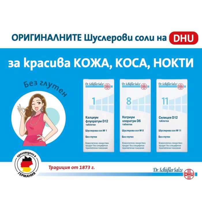 Шуслеровите соли на DHU се произвеждат по оригиналната рецепта на д-р Шуслер, с гарантирана максимална усвояемост и активност на солите. Не съдържат глутен, не могат да бъдат предозирани и не предизвикват привикване.