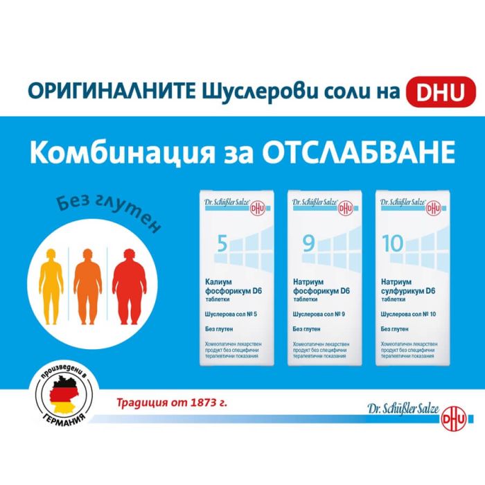 Комбинацията за отслабване с оригиналните Шуслерови соли на Немския хомеопатичен съюз (DHU)* включва: