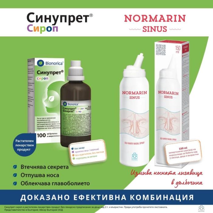 Комплектът съдържа: Bionorica Синупрет Сироп за възпалени синуси 100 мл 1 бр + Нормарин Синус Хипертоничен спрей за нос 150 мл 1 бр.
