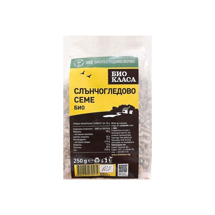 Био Слънчогледово семе, белено Био Класа има отличен баланс между моно- и поли-ненаситени мастни киселини. Съдържа витамини В1, В5, В9 и Е, микроелементите мед, магнезий и селен. Спомага за намаляне нивата на стрес и подобряване функционирането на сърдечно-съдовата система. Спомага за нормалното състояние на кръвоносните съдове и нивата на холестерола. Био Слънчогледово семе, белено Био Класа може да се използва и за покълване. Подходяща добавка към закуски, смути, салати и печива.