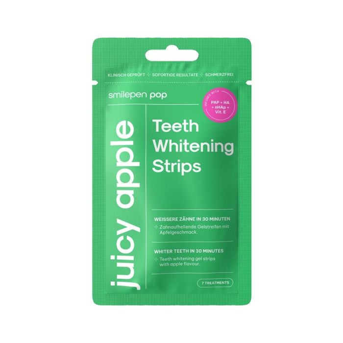 Smilepen Pop Apple Teeth whitening strips са избелващи лентички за зъби, в които вместо традиционния агресивен водороден пероксид е включен съвременният избелващ компонент PAP. Те не причиняват повишена чувствителност на зъбите и запазват здравината на зъбната структура. Формулата съдържа хидроксиапатит, витамин Е, хиалуронова киселина - активни съставки, които укрепват и подхранват както зъбния емайл, така и венците. Смайлпен Поп Избелващи лентички ябълка спомагат да постигнете до 8 тона по-бели зъби само за една седмица. С приятен вкус на ябълки.