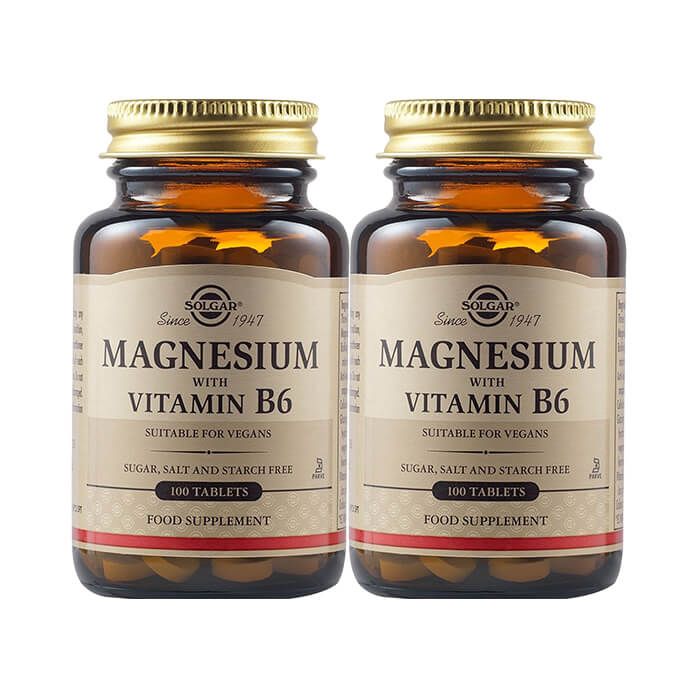 Комплектът съдържа: Solgar Magnesium with Vitamin B6 Магнезий и Витамин В6 х 100 таблетки 2 бр.