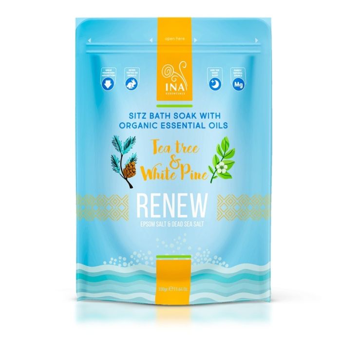 Ina Essentials Renew соли за вана с чаено дърво и бял бор са натурална формула за грижа на краката и ноктите, обогатена със соли, богати на минерали, които омекотяват кожата и я тонизират. Те подпомагат отпускането на уморените крака, намаляват неприятните миризми и създават усещане за свежест и комфорт. Комбинацията от магнезиеви соли и етерични масла прави ваната с тези соли подходяща за терапевтична грижа на краката, релаксация след тежък ден и редовна поддръжка на кожата и ноктите. Етеричното масло от Чаено дърво има антиоксидантно действие, а маслото то Бял бор допринася за ограничаване на раздразненията. Ина Есеншъл Реню Соли за вана с чаено дърво и бял бор са подходящи за употреба при мазоли, твърда кожа и гъбични инфекции по стъпалата.Имат свеж аромат, кожата не се нуждае от изплакване след употреба.