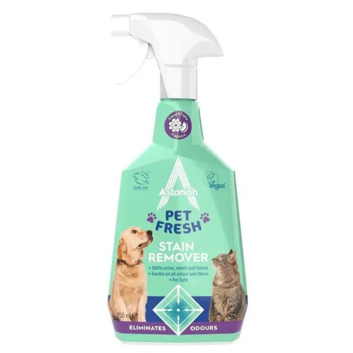 Astonish Anti-stain spray Pet Fresh е почистваща формула за тъкани и дамаски, която ефективно почиства петна оставени от домашни любимци. Астониш Спрей против петна Пет Фреш премахва миризмите и освежава.