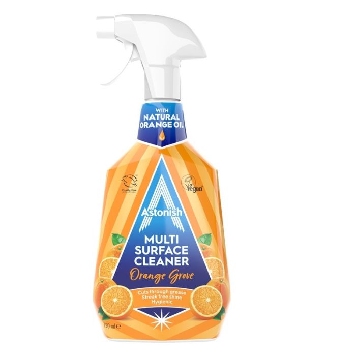 Astonish Multi surface cleaner orange grove е универсален спрей е многофункционален почистващ продукт, който лесно се справя с мазнини, петна и обща мръсотия в дома. Подходящ е за използване върху кухни, мивки, плотове, плочки, кухненски уреди, баня, мебели и други твърди, неабразивни повърхности. Формулата е създадена така, че да оставя повърхностите блестящи и чисти, без да е необходимо силно търкане, а ароматът оставя усещане за свежест и чистота. Астониш Спрей за почистване на всички повърхности, портокал е лесен за употреба, след напръскване е необходимо само да се забърше с мека кърпа.