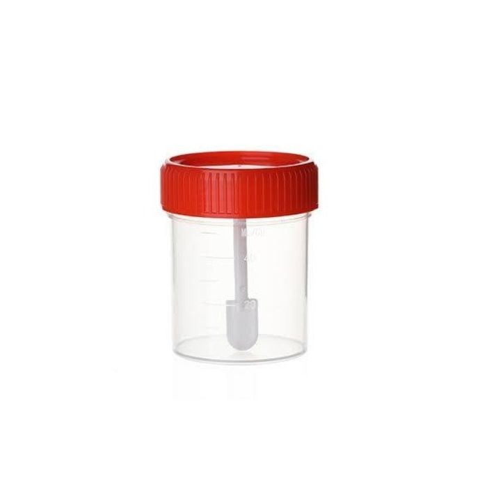 Стерилен контейнер с лъжичка за фекалии е с лъжичка за по-лесно вземане на пробата и капачка с винт за по-лесно затваряне на контейнера. Стерилен контейнер с лъжичка за фекалии е градуиран, прозрачен, опакован в стерилна среда.