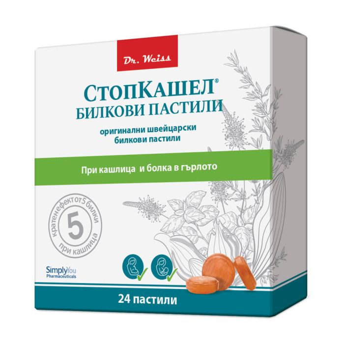 Dr. Weiss Stopkasel Билкови пастили е медицинско изделие под формата на таблетки за смучене с натурални екстракти, което помогна за облекчаване на болки в гърлото, кашлица и други симптоми на настинка. Др. Вайс СтопКашел Билкови пастили съдържат смес от екстракти от живовляк, босвелия, мащерка, босилек и евкалипт, които действат срещу симптомите на обикновена настинка. Пастилите създават защитен слой върху лигавицата на устата и гърлото.