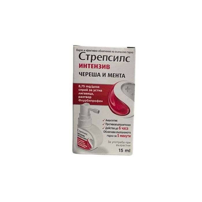 Стрепсилс Интензив спрей череша и мента се прилага краткосрочно за облекчаване на симптомите, характерни при зачервено и болезнеио-възпалено гърло, като дразнене в гърлото, болка, затруднено гълтане и оток при възрастни на и над 18 години.