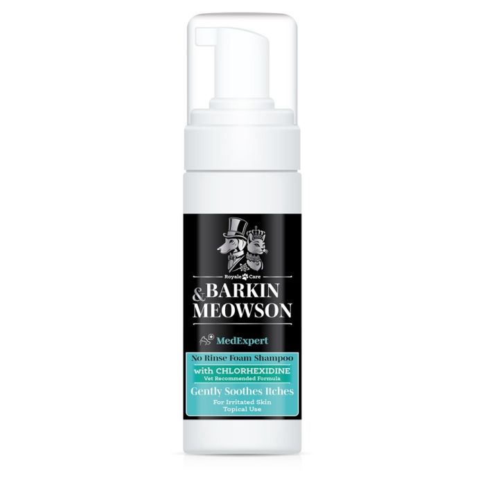 Barkin&Meowson MedЕxpert Chlorhexidine No Rinse Foam Shampoo представлява почистваща и хидратираща пяна без отмиване с хлорхексидин за кучета и котки за локално приложение, предназначена за кучета и котки с чувствителна кожа, склонна към раздразнения и сърбеж. Формулата съдържа хлорхексидин диглюконат – съставка с доказано антисептично и антибактериално действие, която подпомага грижата при кожни проблеми. Идеална за използване като част от поддържаща терапия при дерматологични състояния или след преминало възпаление. Пяната почиства ефективно както кожата, така и козината, без необходимост от изплакване. Обогатена с глицерин и екстракт от невен, които осигуряват дълбока хидратация, успокояват раздразненията и спомагат за намаляване на усещането за дискомфорт. Баркин и Мяусън Сух шампоан-пяна с хлорхексидин без изплакване за кучета и котки е с деликатен аромат, съобразен с чувствителността на домашните любимци.