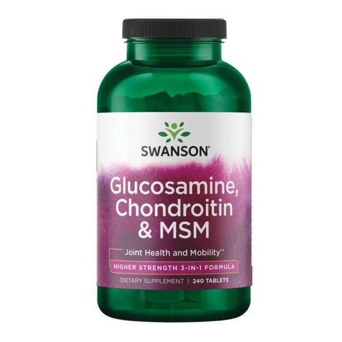 Swanson Glucosamine, Chondroitin & MSM Higher Strength е мощна формула, предназначена да поддържа ставите ви. Тази формула три в едно съчетава хранителните вещества, изграждащи хрущяла (глюкозамин и хондроитин), с допълнителната подкрепа на МСМ (метилсулфонилметан). МСМ е източник на органична сяра с висока бионаличност, която е основен минерал за сухожилията, връзките и други жизненоважни ставни тъкани. Суонсън Глюкозамин, хондроитин и МСМ е формула с висока концентрация.