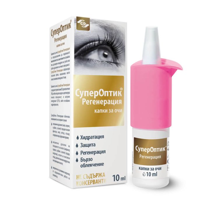 SuperOptik Regeneration Eye Drops са капки за очи, който се грижат за здравето и комфорта на очите, облекчавайки състояния на парене, сърбеж или сълзене. Те подпомагат хидратацията и регенерацията на очите, като същевременно осигуряват успокояващ и ободряващ ефект. Формулата на СуперОптик Регенерация капки за очи е обогатена с натриев хиалуронат и декспантенол, които са ефективни при синдром на сухото око и компенсират липсата на сълзи. Продуктът може да се използва безпроблемно с контактни лещи. Накрайникът за дозиране е оборудван със специален филтър, който предпазва от външни замърсители след отваряне.