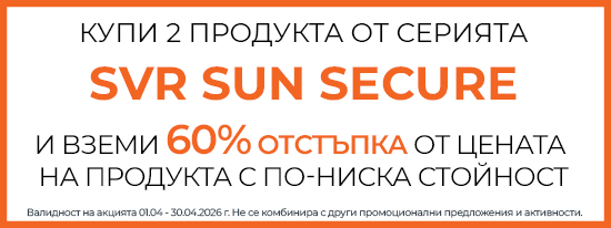 Серията SUN SECURE на SVR е слънцезащита предназначена за чувствителна кожа, която предпазва от UVA, UVB, видима и инфрачервена светлина. Козметичната линия предлага много висока защита, която отговаря на нуждите на цялото семейство - бебета, деца и възрастни. Специалните формули съдържат уникална комбинация от активни съставки и минимизират вредите върху кожата, причинени от слънчевите лъчи, като същевременно подпомагат възстановяването на клетките след излагане на слънце. Продуктите от серията притежават завладяващ летен аромат и приятни текстури.