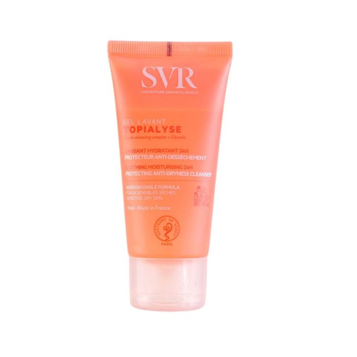 SVR Topialyse Gel Lavant представлява почистващ гел, идеален за ежедневна хигиена на чувствителна и суха кожа. Може да се използва от възрастни, бебета и деца. Гелът деликатно отстранява замърсяванията и оставя кожата чиста, свежа и мека. Специалната формула съдържа нежна почистваща база, която не съдържа сапун и е с физиологично рН, което спомага да се намали усещането за сърбеж. Формулата му е обогатена с омега 3,6,9, която ефикасно защитава и успокоява кожата. СВР Топиалис Измивен гел за суха и чувствителна кожа е приложим върху лице, тяло, бебешки скалп и интимни зони. Без парабени. Тестван под дерматологичен, офталмологичен, гинекологичен и педиатричен контрол. Некомедогенен. Хипоалергенен.