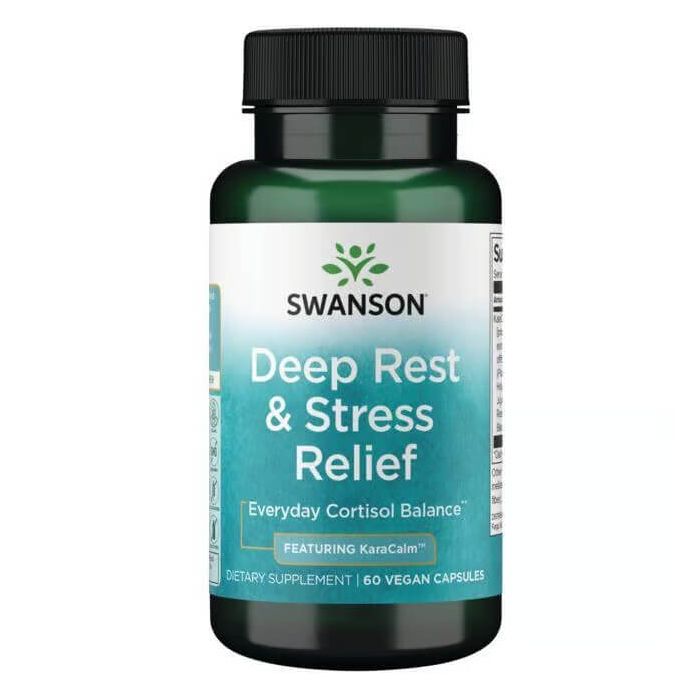 Swanson Deep Rest and Stress Relief Featuring KaraCalm е хранителна добавка с растителен произход, която облекчава симптомите на стрес, подобрява съня и регулира нивата на хормона на стреса кортизол. KaraCalm е съставен от екстракти от валериана, пасифлора, босилек, хинап, розмарин и семена от черен кимион. Валериана традиционно се използва за успокоени, босилекът и розмаринът са популярни билки за облекчаване на тревожността, пасифлората и хинапът са надеждни средства за релаксация, а семената от черен кимион (Nigella sativa) доставят антиоксидантни полифеноли, за да предпазят тялото от оксидативен стрес. Суонсън Комплекс за облекчаване на стреса с KaraCalm подобрява качеството на съня, като увеличава общото време, прекарано в сън, намалява времето, необходимо за заспиване, и намалява броя на събужданията по време на сън.
