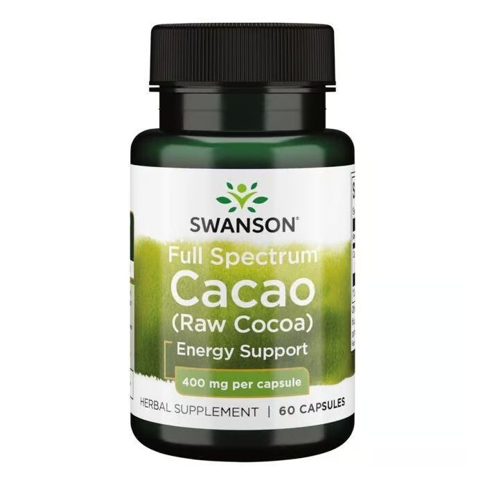 Swanson Full Spectrum Cacao (Raw Cocoa) е хранителна добавка предоставяща какао с високо качество под формата на капсули. Хранителната добавка Суонсън Какао пълен спектър (сурово какао) съдържа сурово какао, което има антиоксидантни свойства. Спомага за повишаване на нивата на енергия, за баланса на холестерола и кръвната захар и подкрепя сърдечната функция.