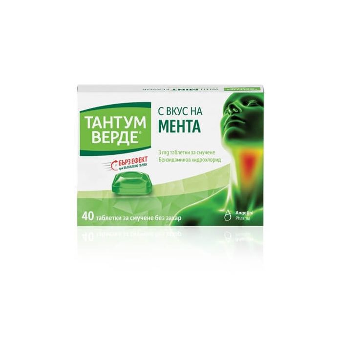 ТАНТУМ ВЕРДЕ с вкус на мента са таблетки за смучене, съдържащи бензидаминов хидрохлорид. Бензидаминовият хидрохлорид притежава изразени противовъзпалителни и болкоуспокояващи свойства. В резултат на бързото проникване и локалното натрупване във възпалената тъкан се стига до бързо затихване на симптомите. Tantum Verde Mint е с добра локална поносимост и води до намаляване на оплакванията при преглъщане. ТАНТУМ ВЕРДЕ Мента се прилага при болезнени възпаления в устната кухина и гърлото, възпаления на венците, на сливиците, възпаления на лигавицата на гърлото и на ларинкса. Особено подходящ е за намаляване на оплакванията при простудни заболявания. Не съдържа захар.
