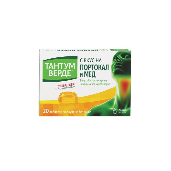 ТАНТУМ ВЕРДЕ с вкус на портокал и мед е лекарство без лекарско предписание, под формата на таблетки за смучене. Съдържаща бензидаминов хидрохлорид, който притежава изразени противовъзпалителни и болкоуспокояващи свойства. В резултат на бързото проникване и локалното натрупване във възпалената тъкан се стига до бързо затихване на симптомите. Tantum Verde orange and honey е с добра локална поносимост и води до намаляване на оплакванията при преглъщане. ТАНТУМ ВЕРДЕ Портокал и Мед се прилага при болезнени възпаления в устната кухина и гърлото, възпаления на венците, на сливиците, възпаления на лигавицата на гърлото и на ларинкса. Особено подходящ е за намаляване на оплакванията при простудни заболявания.