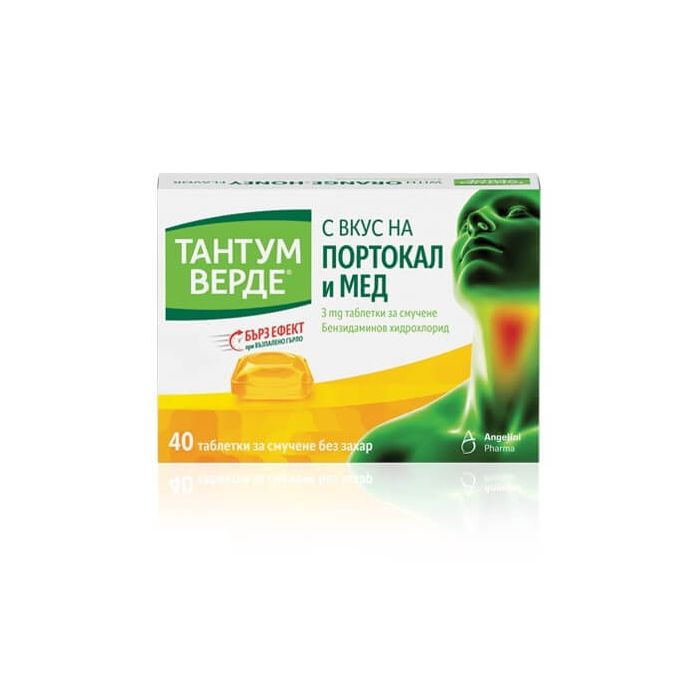 ТАНТУМ ВЕРДЕ с вкус на портокал и мед е лекарство без лекарско предписание, под формата на таблетки за смучене. Съдържаща бензидаминов хидрохлорид, който притежава изразени противовъзпалителни и болкоуспокояващи свойства. В резултат на бързото проникване и локалното натрупване във възпалената тъкан, се стига до бързо затихване на симптомите. Tantum Verde orange and honey е с добра локална поносимост и води до намаляване на оплакванията при преглъщане. ТАНТУМ ВЕРДЕ Портокал и Мед се прилага при болезнени възпаления в устната кухина и гърлото, възпаления на венците, на сливиците, възпаления на лигавицата на гърлото и на ларинкса. Особено подходящ е за намаляване на оплакванията при простудни заболявания.Не съдържа захар.