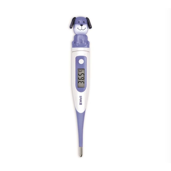 Електронен термометър за деца куче B.Wеll PRO-06 е висококачествен медицински уред, предназначен за измерване на телесната температура на детето още от най-ранна възраст. Електронен термометър за деца куче Би Уел ПРО-06 има гъвкав накрайник, осигуряващ нежен допир до деликатната детска кожа. Благодарение на своята форма, наподобяваща играчка куче, детето бързо се отпуска при измерване на температурата. Термометърът се отличава с точно измерване в рамките на 10 секунди, като алармира при висока температура. Съхранява стойността от последното измерване. Предлага се с капаче за удобно и безопасно съхранение. Водоустойчив. От безопасни материали.