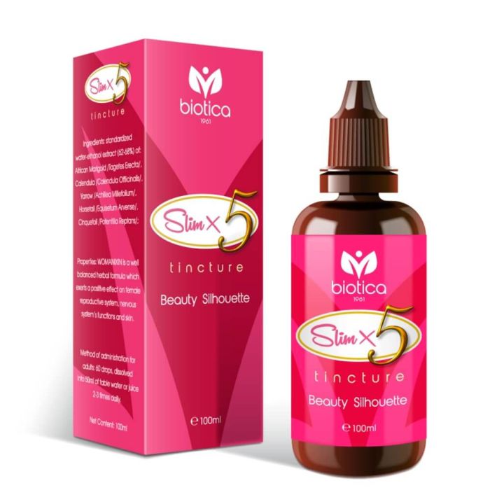 Slim x5 е тинктура за отслабване с 5 действия. Тинктура Слим х5 подкрепя организма за изгаряне на подкожните мазнини, активиране на метаболизма, изхвърленя на задържаните течности, редуциране на целулита при жените и зареждане на организма с енергия.