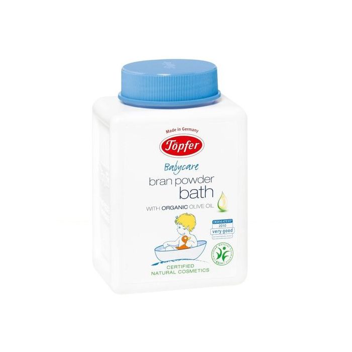 Topfer Baby Powder Bath with Organic Olive Oil 250 g e бебешка пудра за вана с био пшенични трици и маслиново масло. Тьопфер Бебешка пудра за вана с пшенични трици и маслиново масло 250 гр има освежаващ, омекотяващ, успокояващ и хидратиращ ефект върху деликатната бебешка кожа. Пудрата за вана Töpfer се отличава и с нежното си почистващо действие. Töpfer Baby Powder Bath се препоръчва от немските педиатри и акушери вече от над 80 години. Подходяща и за новородени. Без синтетични аромати. Без оцветители. Без консерванти. 100% естествени съставки.