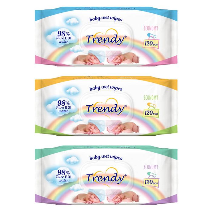 Trendy Мокрите кърпи за бебета са специално създадени, за да нежно почистват и овлажняват деликатната бебешка и детска кожа, като същевременно я подхранват. Тренди Мокрите кърпи са формулирани така, че да не предизвикват дразнение и да осигурят максимален комфорт за вашето бебе. Продуктът е предназначен за практично използване благодарение на капака, който ги запазва свежи и влажни.