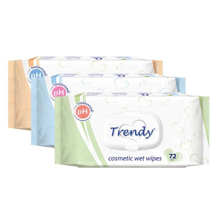 Trendy Cosmetic wet wipes ефективно почистват и отстраняват замърсяванията, като същевременно са нежни и щадящи кожата. Те са подходящи за ежедневна употреба и оставят приятно усещане за свежест благодарение на деликатния аромат. Тренди Козметични кърпички с капак са формулирани така, че да не предизвикват дразнение и да осигурят максимален комфорт. Благодарение на капака, се запазват свежи и влажни. Опаковките са с 3 различни цветни дизайна.