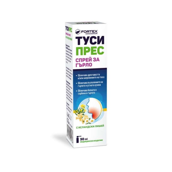 Тусипрес спрей за гърло е предназначен за облекаване на симптомите при инфекции на устната кухина, гърлото или горните дихателни пътища.
