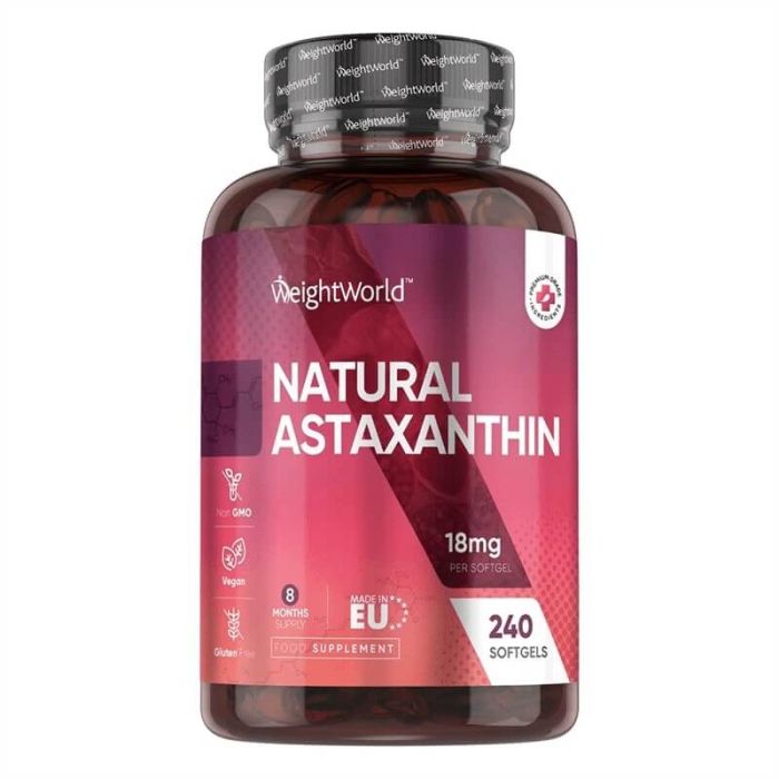 Weight World Natural Astaxanthin e хранителна добавка, която подпомага защитните сили, когнитивната функция и естествените енергийни нива на тялото. Weight World Астаксантин (от микроводорасли) може да допълни цялостното благосъстояние и жизненост. Астаксантинът не се произвежда естествено в човешкия организъм и ефектите от действието му могат да се използват за здравето чрез прием на специално произведени продукти. Концентрираната доза от 8 mg естествен астаксантин в капсулите на Weightworld е с висока бионаличност и превъзходна абсорбция.