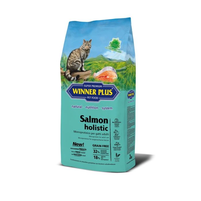 Winner Plus Super Premium Pet Food Salmon holistic е питателна, натурална и пълноценна храна без глутен и зърно, подходяща за котки в напреднала възраст от всички породи. Уинър Плюс Супер Премиум Пет Фууд Салмон Холистична храна с прясна сьомга за котки в напреднала възраст от всички породи е висококачествена монопротеинова храна, която доставя на вашата котка всички нужни хранителни вещества, които я поддържат здрава и жизнена. Сьомгата е единственият източник на животински протеин в храната. Този изчистен от алергени състав, прави храната лесносмилаема и изключително подходяща за котки с алергии и нетолерантност към месо, глутен, зърно и зърнени култури. Оптималното съотношение на Омега-3 и Омега-6 мастни киселини в състава спомага за поддържането на здрава кожа и лъскава козина на вашия домашен любимец.