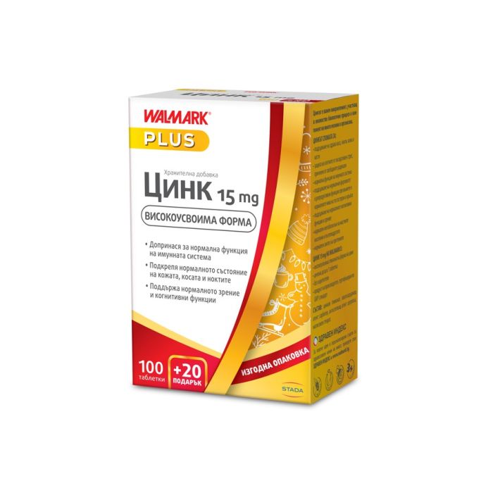 Walmark Zink за имунитет 15 мг х 100+20 таблетки е хранителната добавка с висока концентрация на високоусвоима форма на минерала цинк. Добавката благоприятства състоянието на косата, кожата и ноктита, като в същото време повишава имунитета. Валмарк Цинк за имунитет 15 мг х 100+20 таблетки осигурява на тялото необходимата му дневна доза от минерала цинк. Цинкът участва в над 300 ензимни реакции в човешкото тяло и благоприятства повечето системи. Стимулира метаболизма и допринася за нормалния синтез на ДНК. Също така влияе благоприятно при различни видове кожни проблеми като себорея, екзема, косопад, подобрява и заздравява ноктите, стимулира правилната функция на половите оргони и влияе благоприятно върху простатата. В същото време цинковият дефицит може да причини косопад, кожни проблеми, чупливост на ноктите, умора, влошаване на зрението, смущения в кръвообразуването, трудно зарастване на костни фактури. При мъжете влияе негативно и на функцията на простата и нейното уголемяване. Цинкът намалява риска от сърдечни болести, увреждания на мозъка и нервната система, лошо храносмилане, язви, хранителни алергии, лошо зарастване на рани, остеопороза, кожни болести, хронична отпадналост, загуба на апетит и други проблеми.